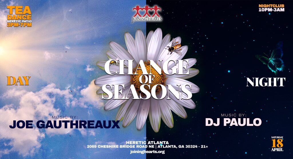 Get ready a highly anticipated community celebration in Atlanta as Joining Hearts marks 39 years of impact with Change of Seasons: Tea Dance & Night Party. This isn’t just an event; it’s a full-day experience designed to keep you moving from sunlit beats to after-hours euphoria, all powered by world-class DJs and an electrifying crowd.