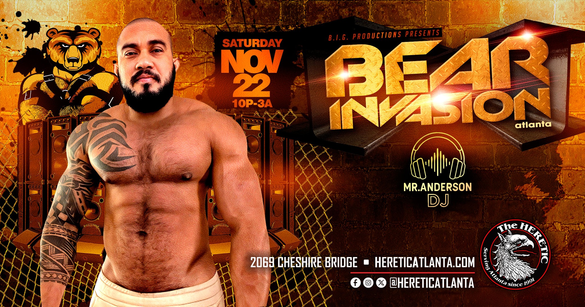 Bearracuda is back to strip down with 600+ guys on Saturday, Nov. 8th! TDON makes his Bearracuda debut at Heretic. Hot GoGos all night - doors at 10pm! Clothes check available. Join us for our final party of the year! Adv tix available here: https://www.eventbrite.com/.../bearracuda-atlanta-bulges... We're located inside of The Heretic - 2069 Cheshire Bridge Road.10pm-3am
