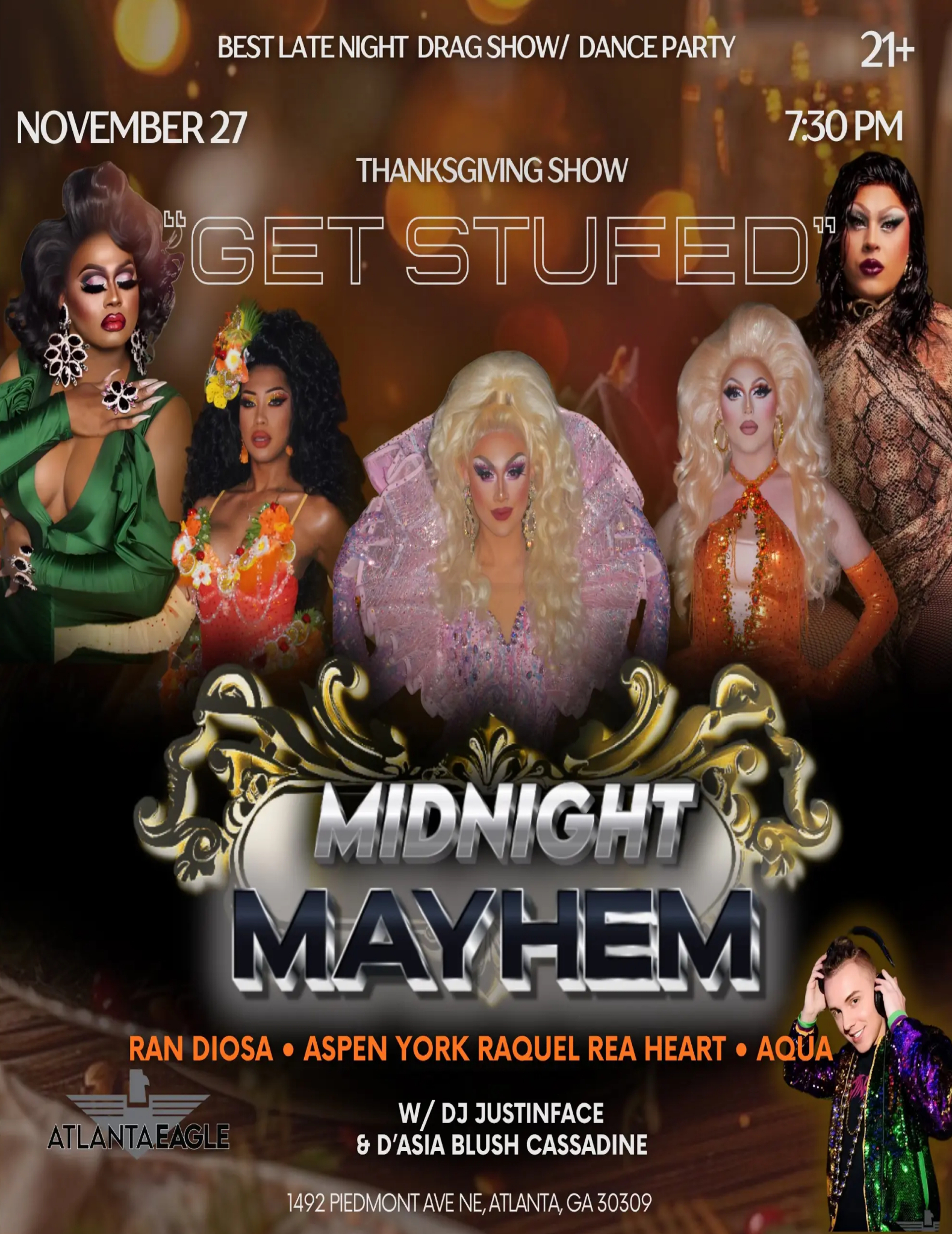Join us for a special Thanksgiving edition of Midnight Mayhem at the Atlanta Eagle!The “Get Stuffed” show kicks off at 7:30 PM with an incredible lineup: Ran Diosa, Aspen York, Raquel Rea Heart, and Aqua.Music by DJ Justinface and D’Asia Blush Cassadine.21+ event1492 Piedmont Ave NE, Atlanta, GA 30309Don’t miss the best late-night drag show […] |