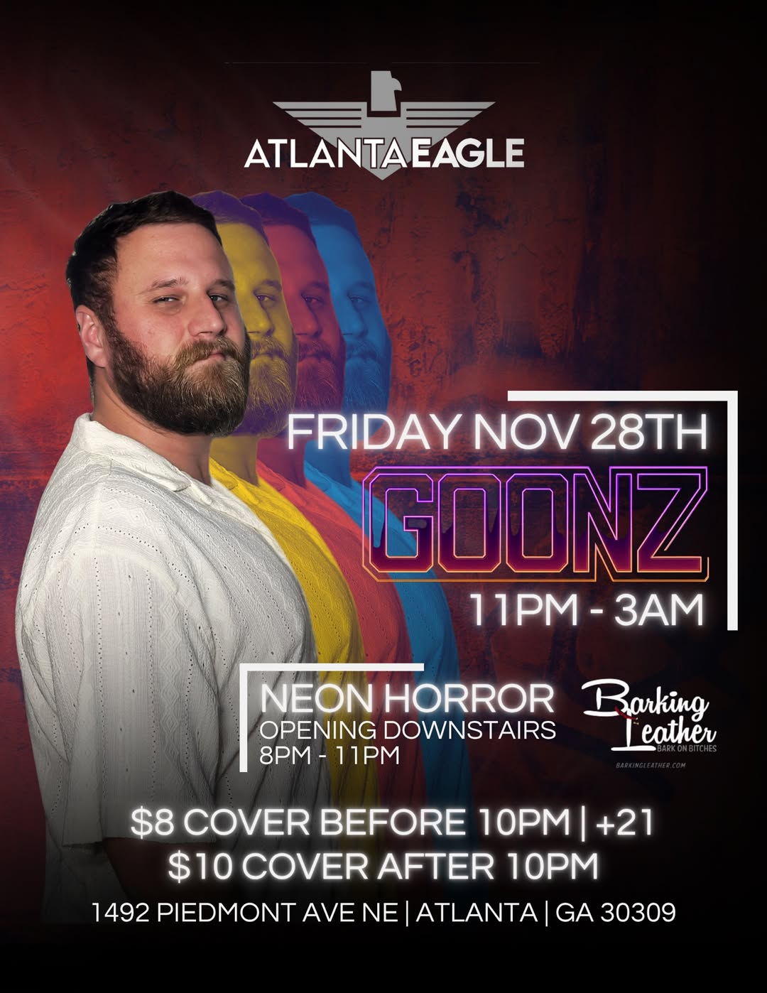 Friday, Nov 28th, GOONZ takes over the Atlanta Eagle from 11PM to 3AM! Neon Horror opens downstairs from 8PM to 11PM. $8 cover before 10PM $10 cover after 10PM 21+ event Join us at 1492 Piedmont Ave NE, Atlanta, GA 30309. #atlanta #atlantaeagle #atlantaevents #atlantaga #atlantageorgia #atlantanightlife #atlantanights #dragqueen #gay #gaybar #gayclub #gaynightlife #gays #gaystagram […] |