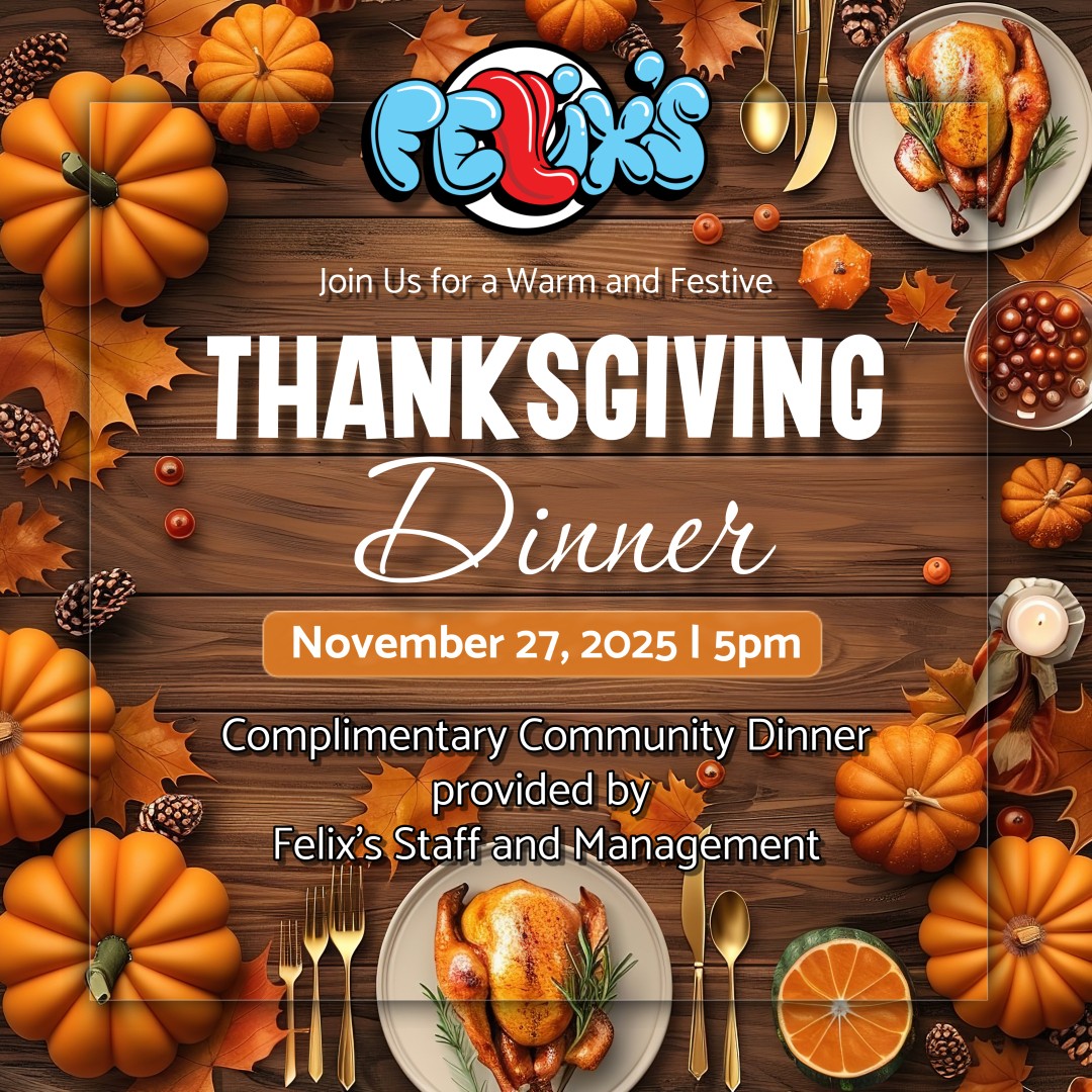 Thursday, Nov 27 Bar opens at 3PM | Dinner served at 5PM | Open ‘til 3AM This Thanksgiving, we’re keeping it in the family. Join us for a Complimentary Community Dinner — cooked and served with love by the Felix’s staff and management. Whether you’re flying solo, bringing your chosen fam, or just want a […]