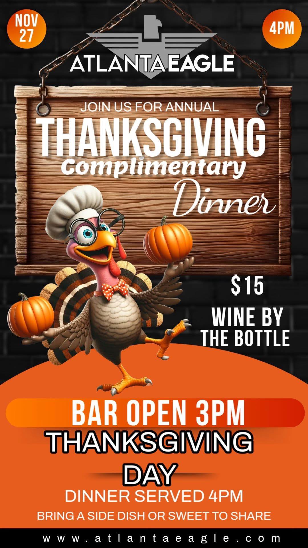 Thanksgiving Dinner Complimentary - Bring a Side or Dessert. Food begins at 4pm will be upstairs sit down. Thank you to Don Melville and our Leather Friends for Hosting. The Eagle is proud to serve our third annual dinner. Please support your bartenders as we have $5 Vodka / $3 Beers and $15 Wine bottles.