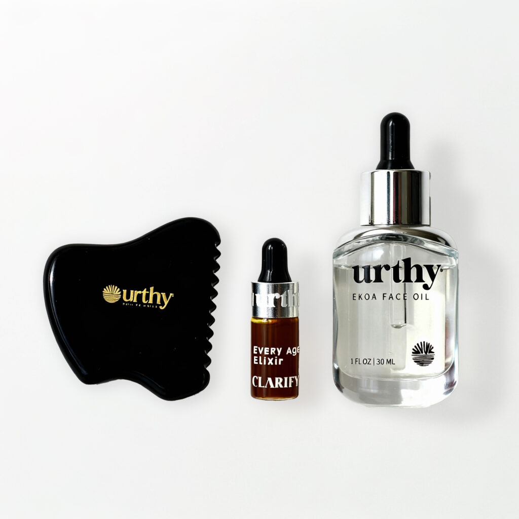 The Elixir Ritual Combo pairs your choice of one of Urthy’s six targeted Every Age™ Elixirs with Ekoa™ Face Oil and a handcrafted Gua Sha Stone for a transformative skincare experience.
